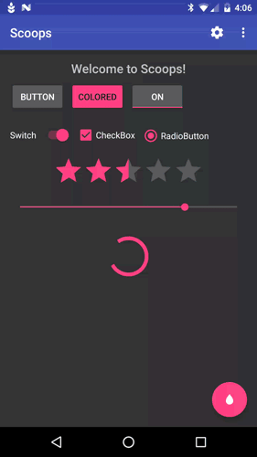 ScoopSettingsActivity.createIntent(Context, "Some title to use");This is the ability to have a view or attribute update it's color (background, src, text, etc) whenever the user/developer chnages the color for a defined property, or Topping. Please refer to Sample App for actual code references.