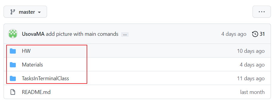 У нас три папки (созданные мной, в них лежат задания).