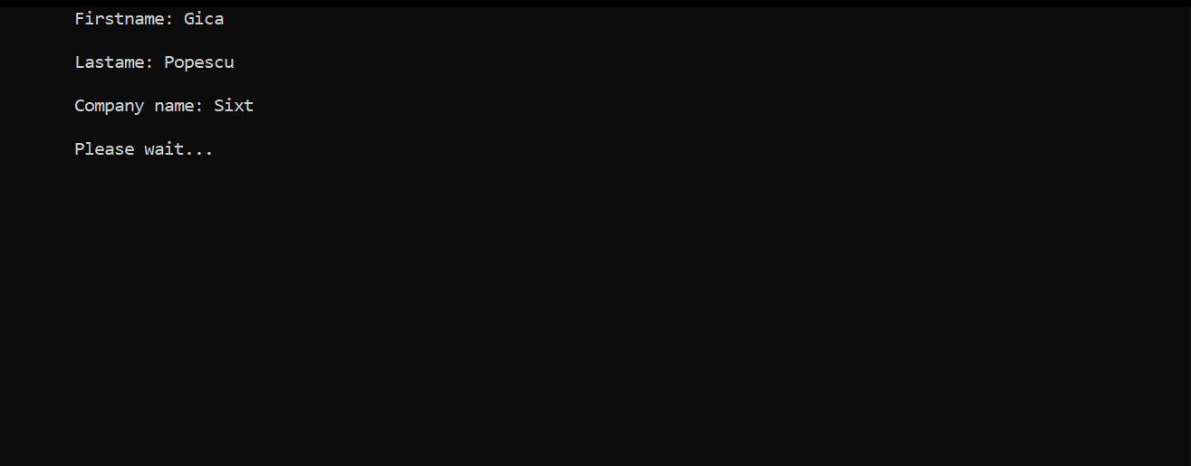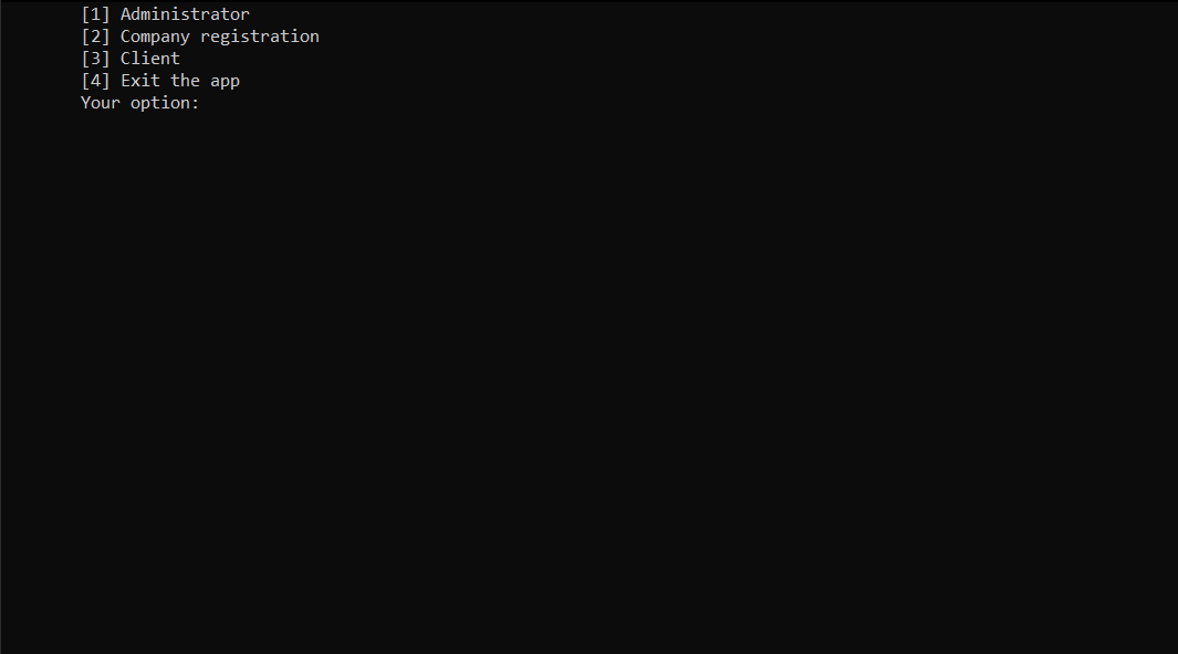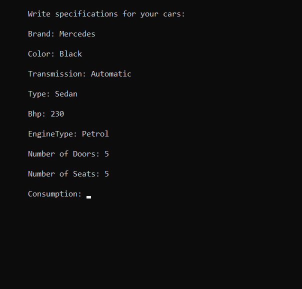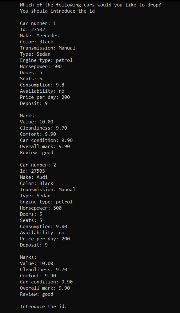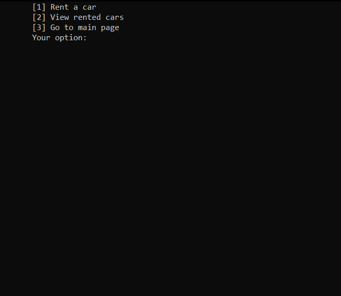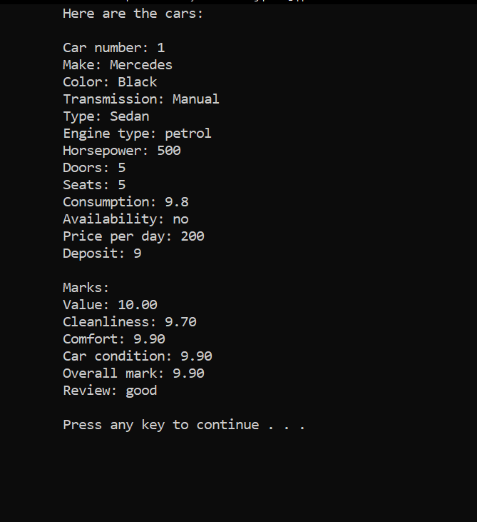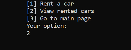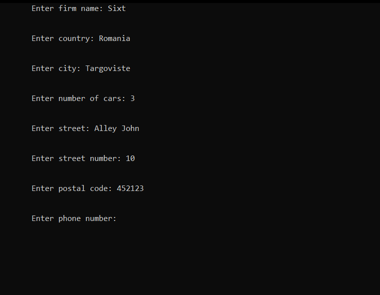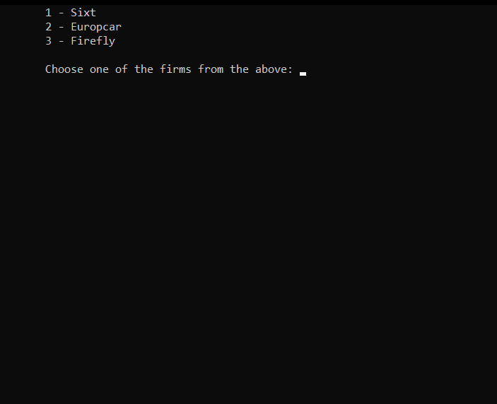 After selecting the first option, the user should introduce the firm name, country, city, the number of the cars, phone number etc. Afterwards, the user should introduce the specifications for each car, from make, color to number of seats, doors and payment details. After completing all the steps, the firm will be registered and available in the firms list for clients.