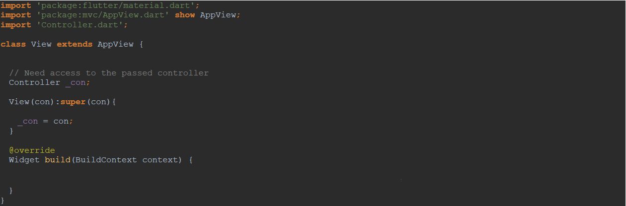 Below, for example, are subclasses of those three MVC Classes. Now you fill them up with what will make up your Flutter applcation (with the appropriate code in the appropriate Class), and you're done!