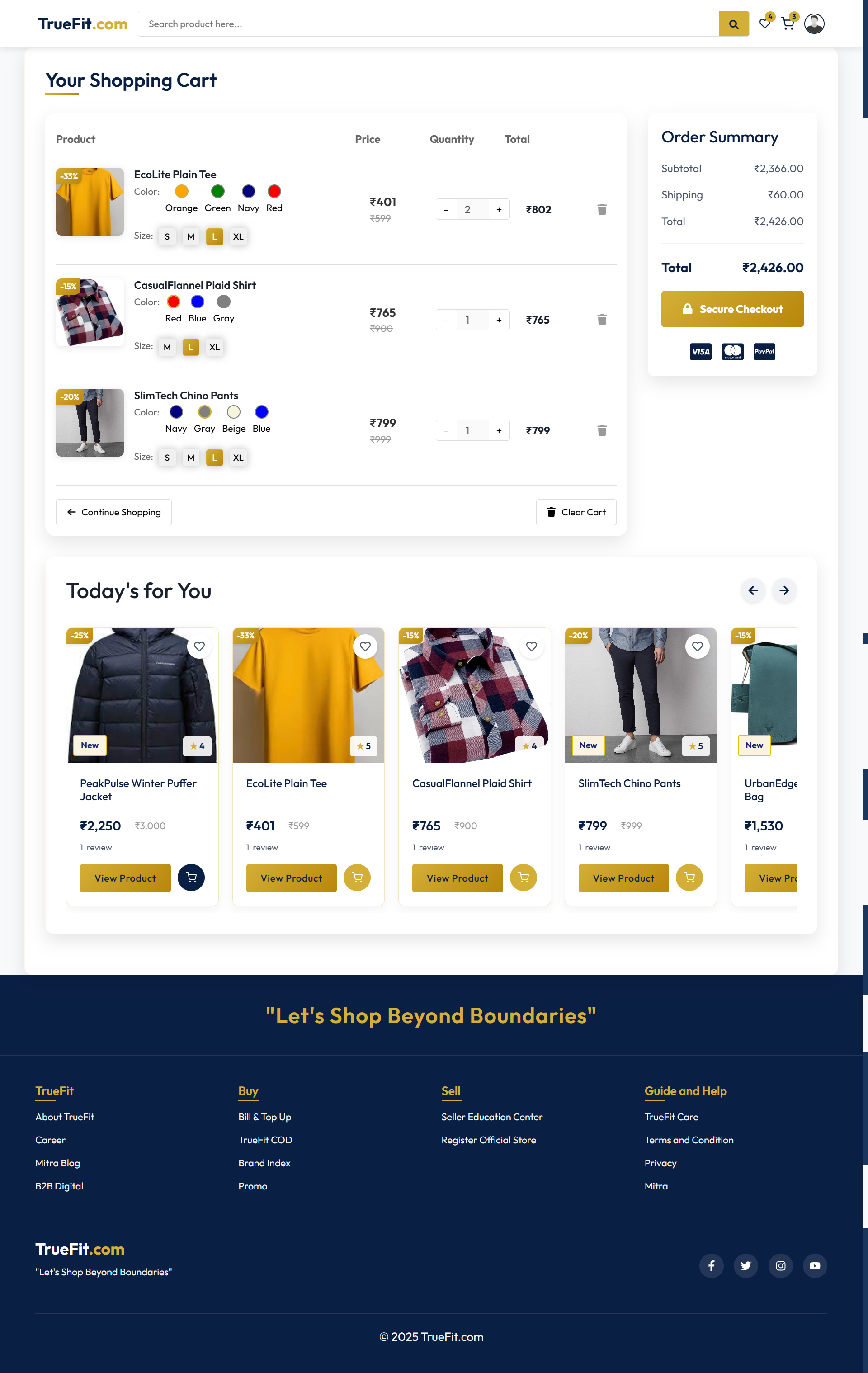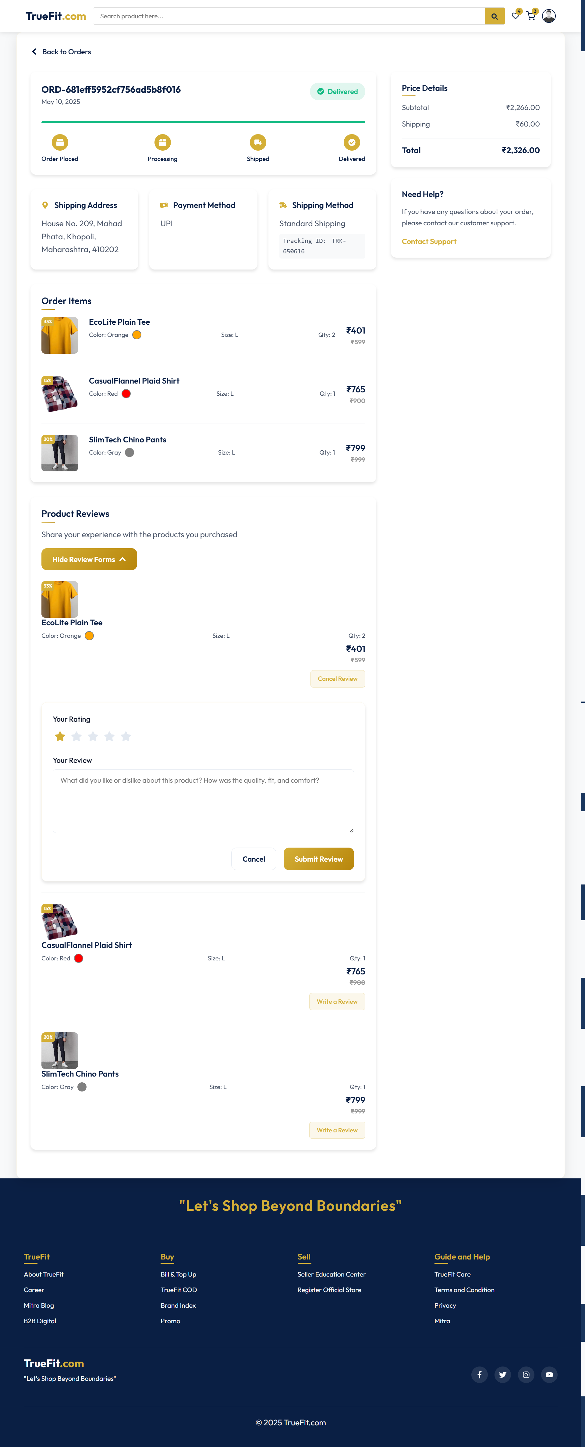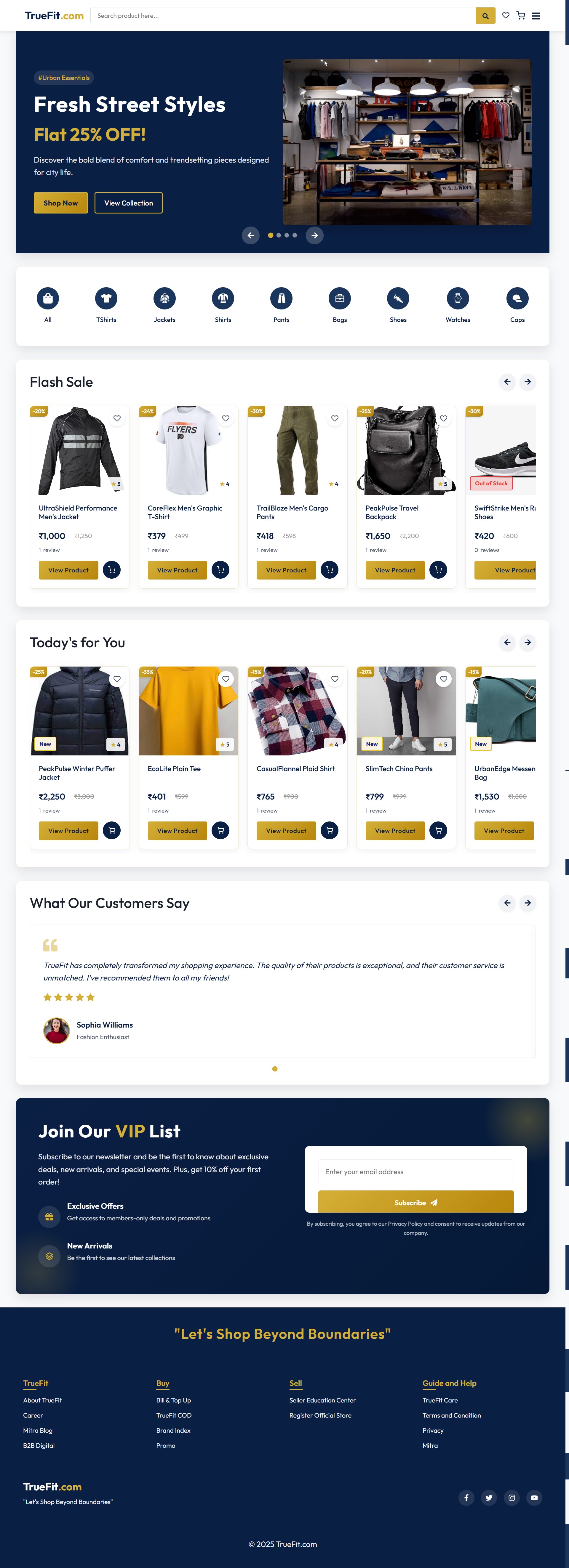 TrueFit delivers a rich shopping experience with features like multi-category product listings, secure user authentication (OTP & Google), wishlist, shopping cart, checkout, order tracking, and user profile management. Admins can manage products, orders, coupons, and the hero banners through a protected interface.