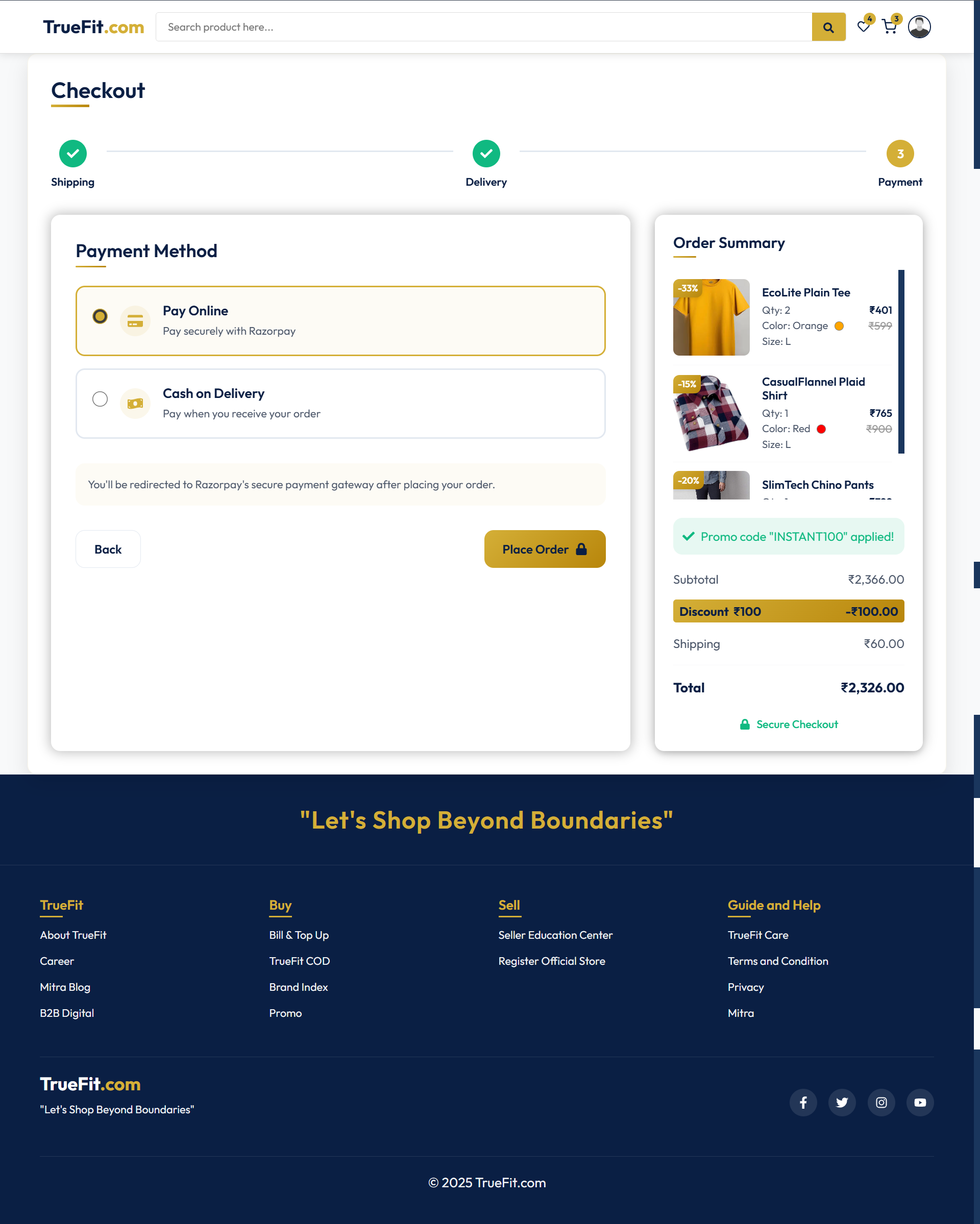 - Multiple payment options including online (UPI, Card, etc) and Cash on Delivery