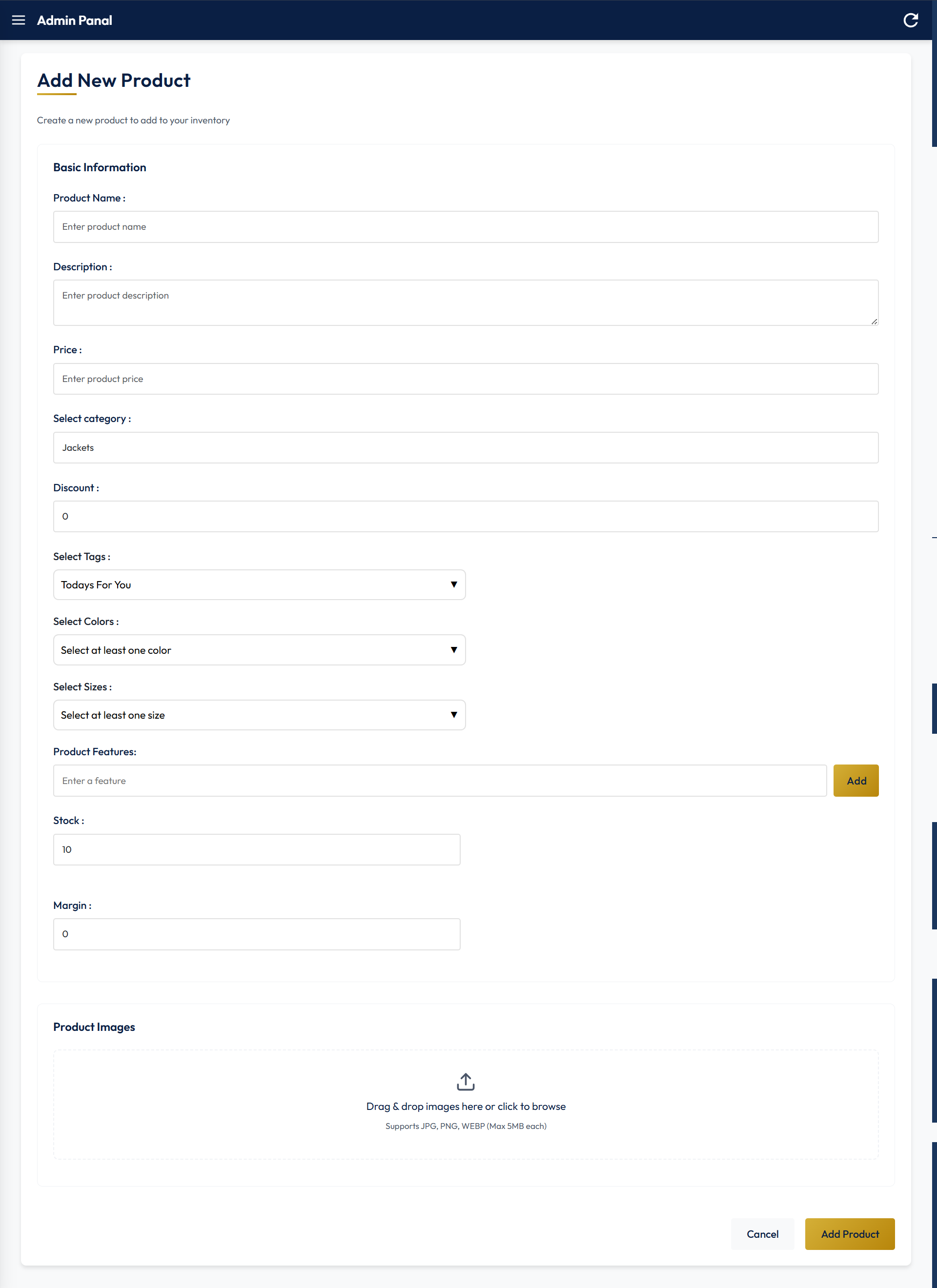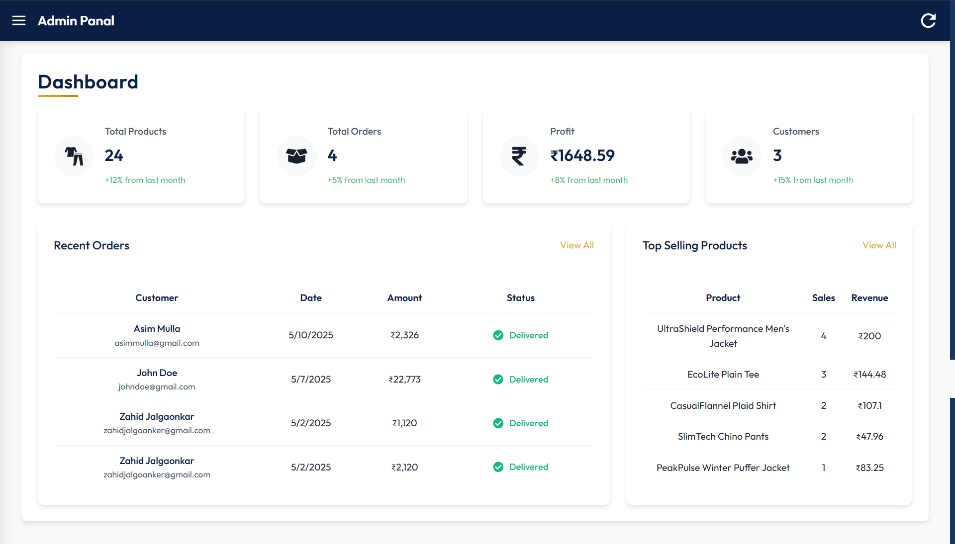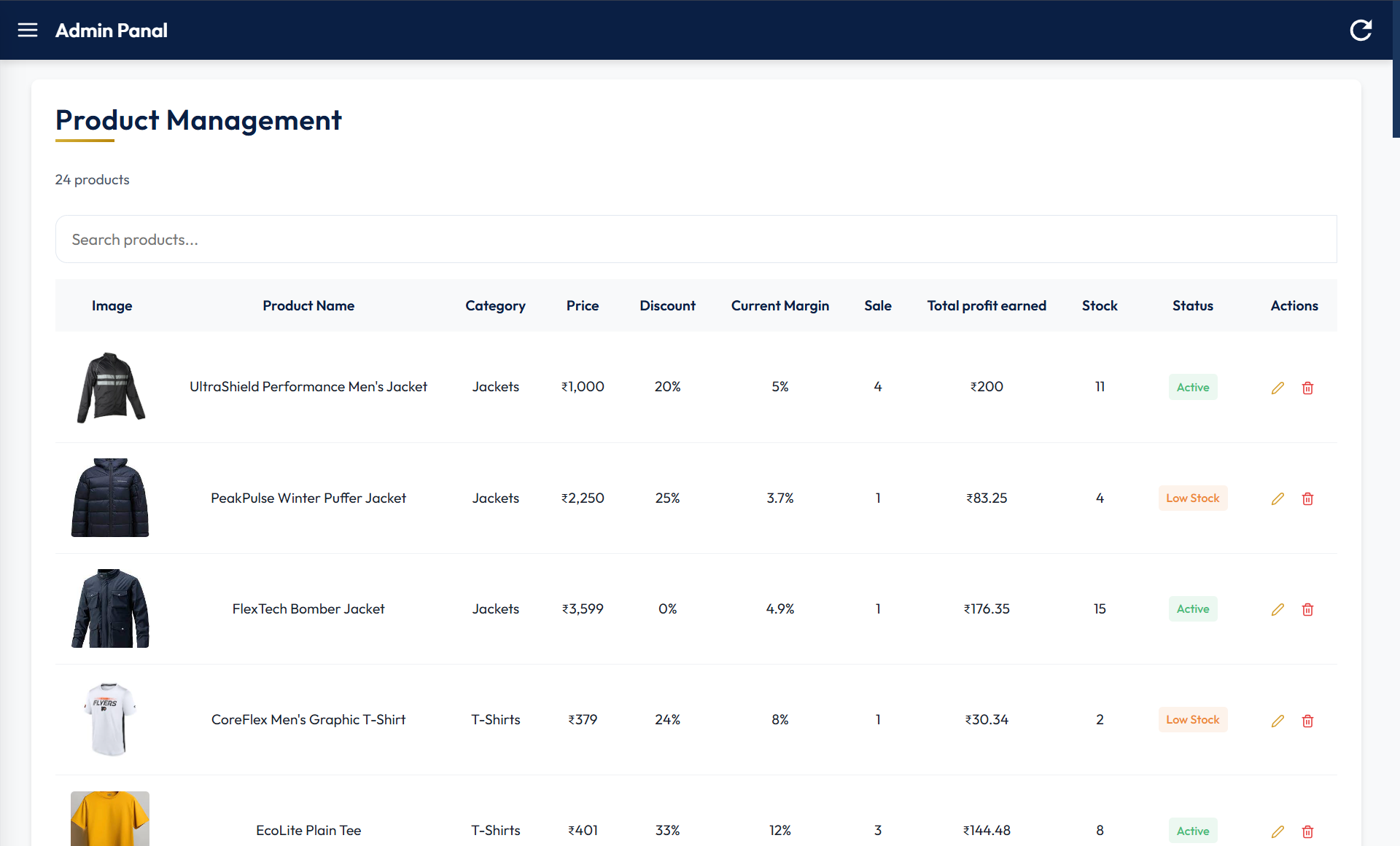 | Admin Panel Sidebar | Dashboard | Product Management |