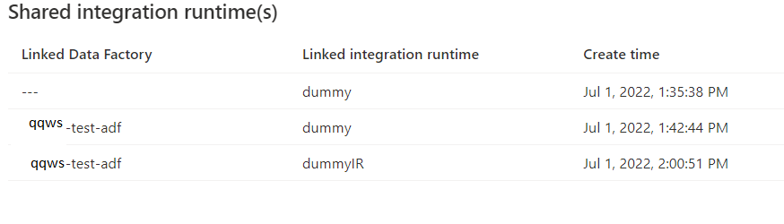 I cannot see the dummyIR in Integration runtimes in qqws-test-adf, but it appears in linked menu: