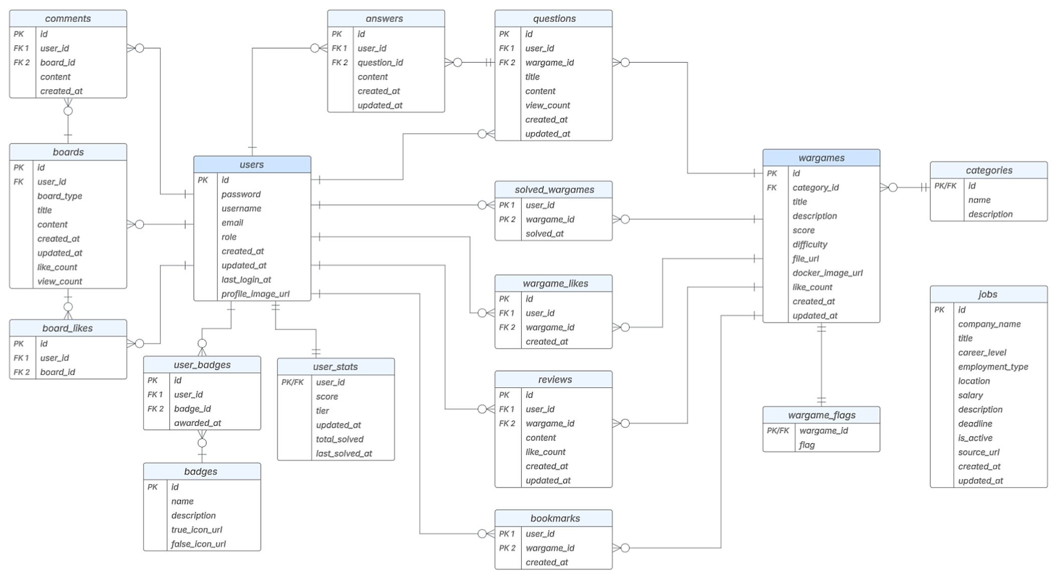 위 두 테이블을 중심으로, 사용자 활동과 워게임 콘텐츠를 둘러싼 대부분의 기능 테이블이 유기적으로 확장되며 ERD가 전개됨