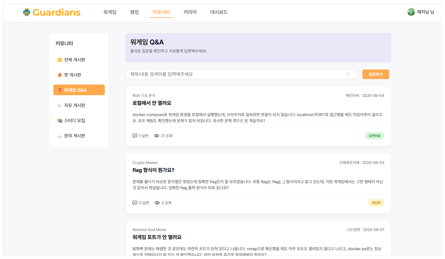 • 좌측 카테고리 메뉴 : 전체 게시판 / 핫 게시판 / 워게임 Q&A / 자유 게시판 / 스터디 모집 / 문의 게시판