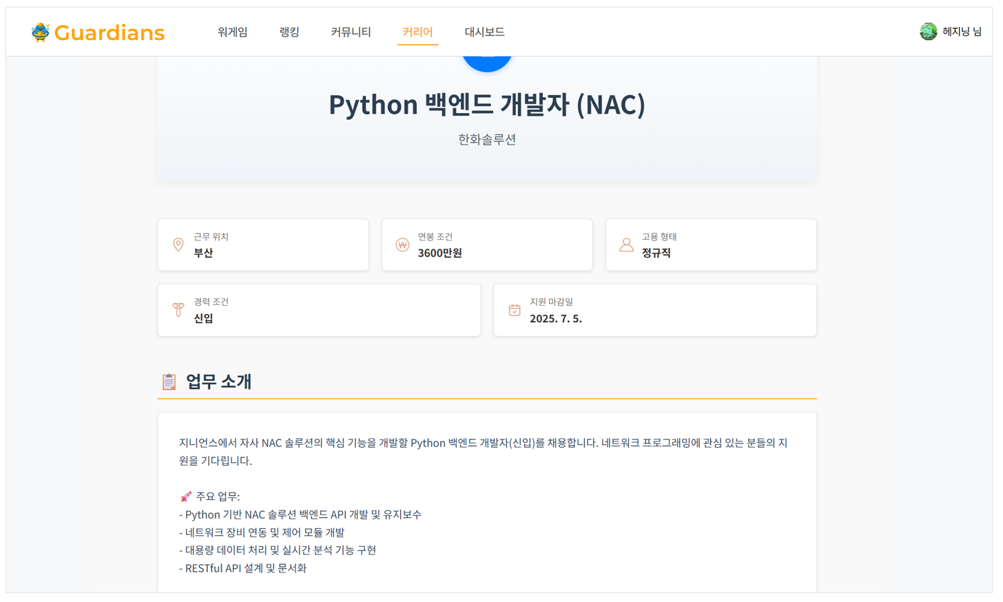 | 커리어 | 보안 분야 채용공고 목록 및 상세정보 확인, 필터링 검색 |