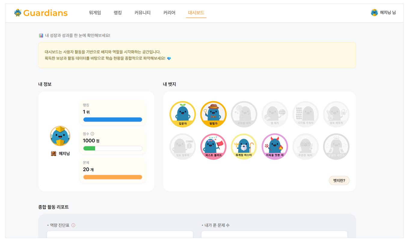 | 대시보드 | 획득한 뱃지, 역량 진단표, 타임라인 등 사용자의 종합 활동 리포트 시각화 |