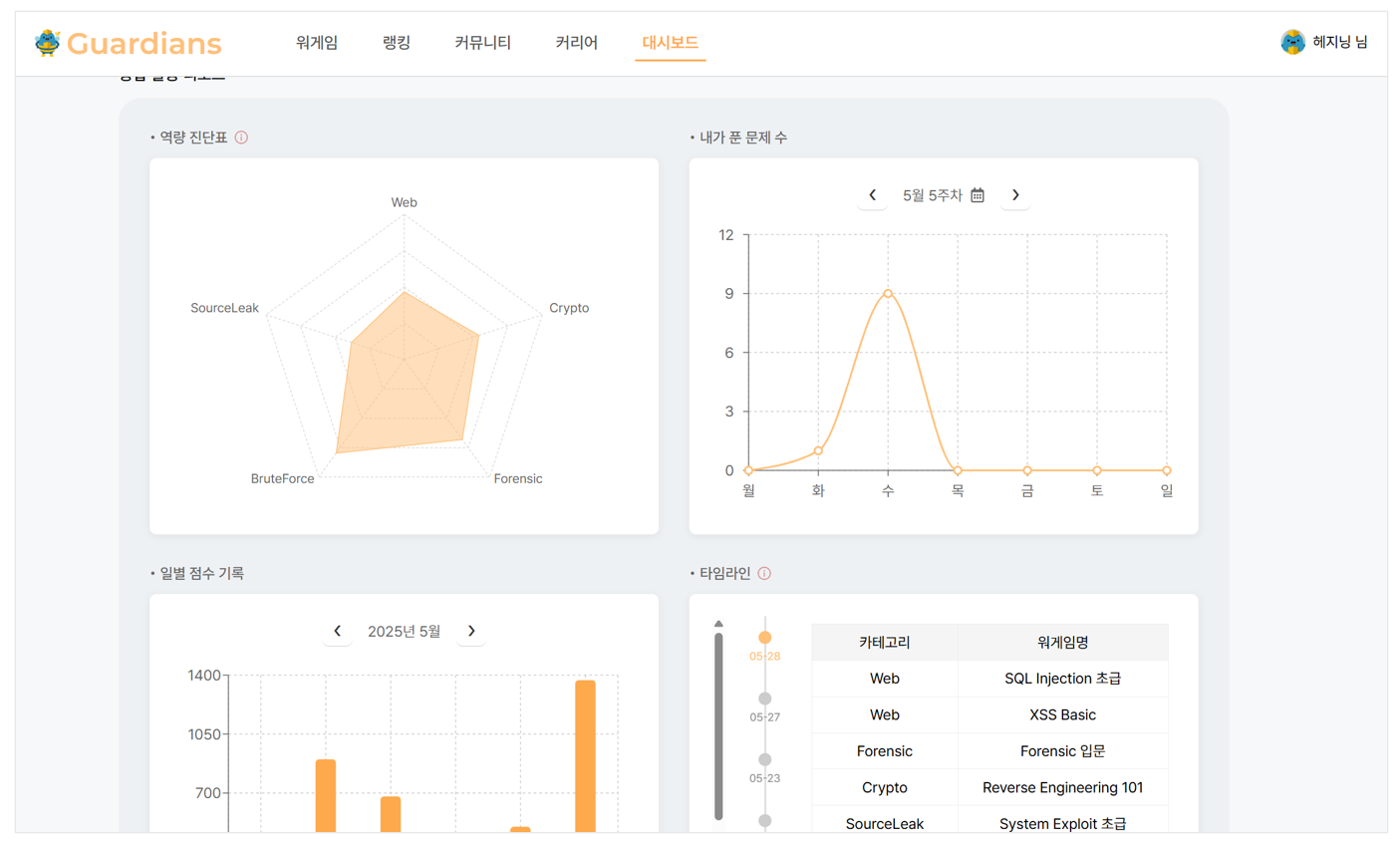 • 종합 활동 리포트 영역 : 역량 진단표 (Radar Chart) / 내가 푼 문제 수 (요일별 그래프) / 일별 점수 기록 (막대 그래프) / 풀이 타임라인