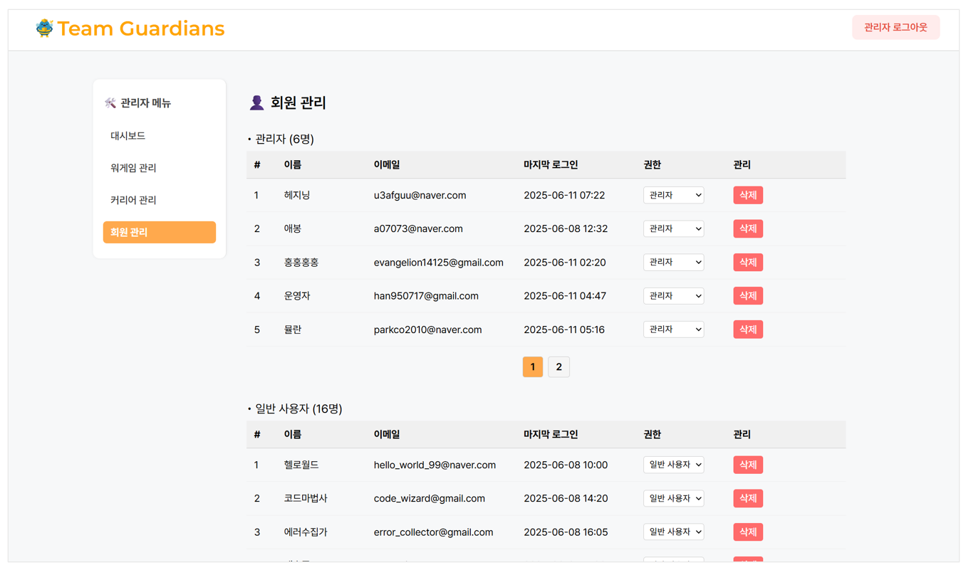 • 회원 관리 기능 : 관리자 그룹과 일반 사용자 그룹을 나눠서 표시 (권한, 삭제 버튼 포함)