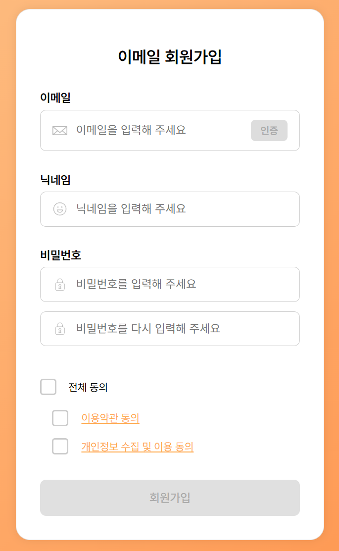 • 회원가입 폼 : 이메일 인증, 닉네임 입력, 비밀번호 2회 입력