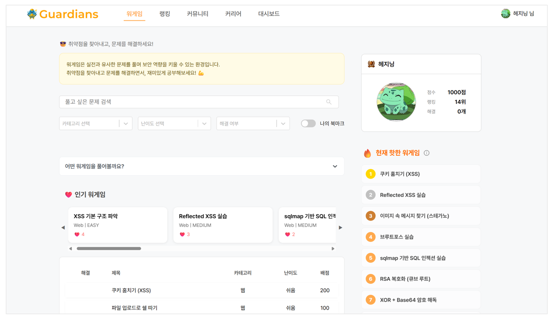 • 인기 워게임 추천 영역 : 사용자가 많이 푼 인기 워게임이 카드 형태로 좌우 슬라이드