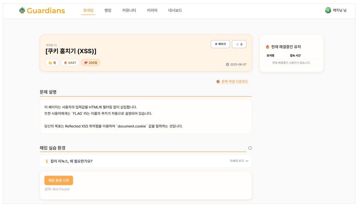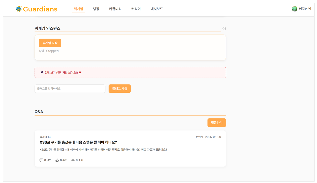 | 채점 시스템 | 사용자 Flag 제출 시 자동 채점 및 정답 여부 실시간 확인 |