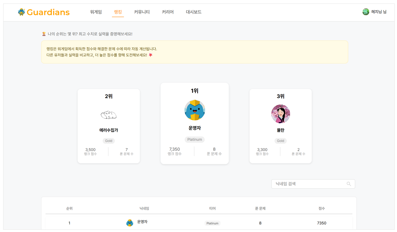 • 상위 TOP 3 프로필 카드 : 닉네임, 프로필 사진, 총 점수, 푼 문제 수 표시