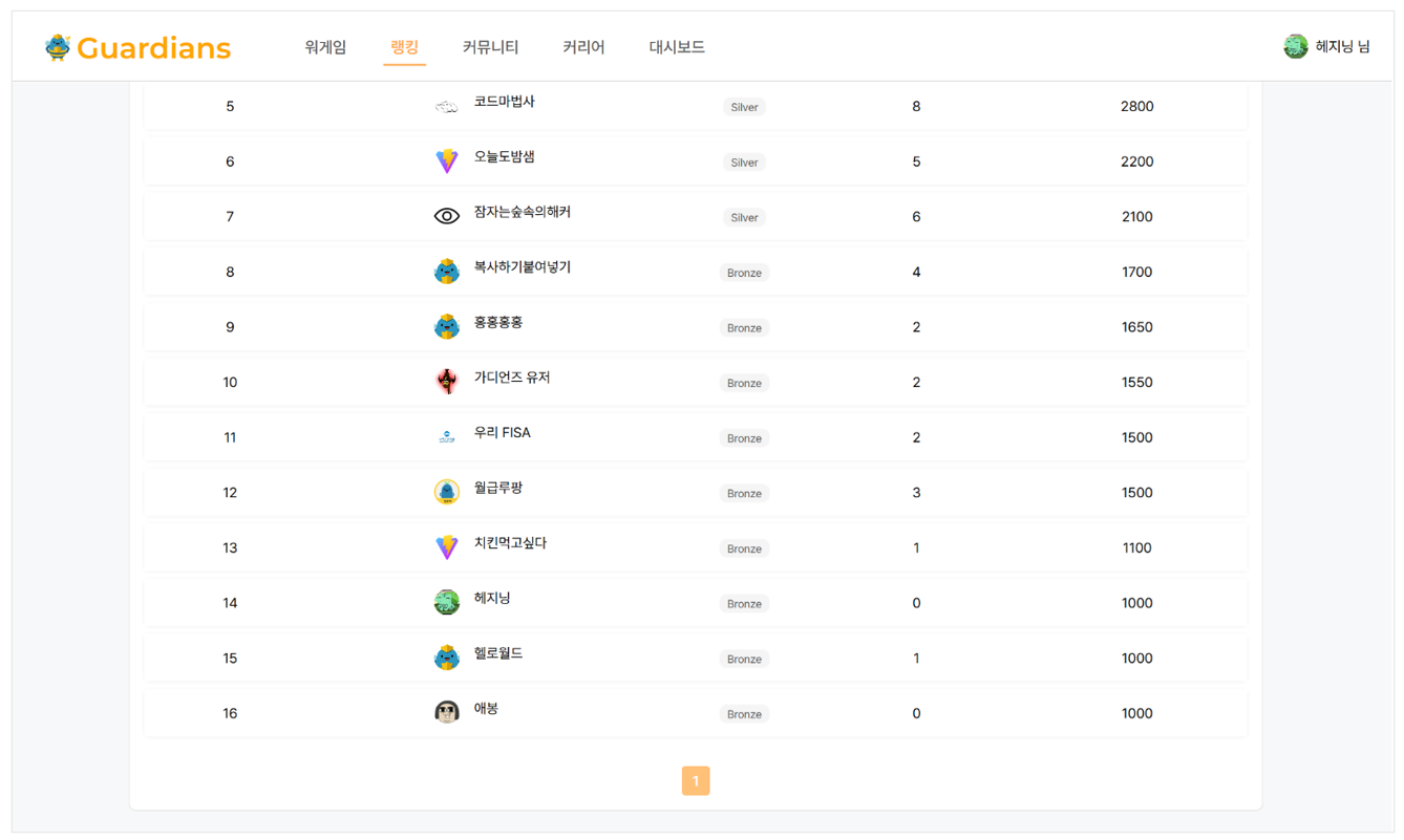 • 전체 유저 순위 테이블 : 표 형태로 나열
