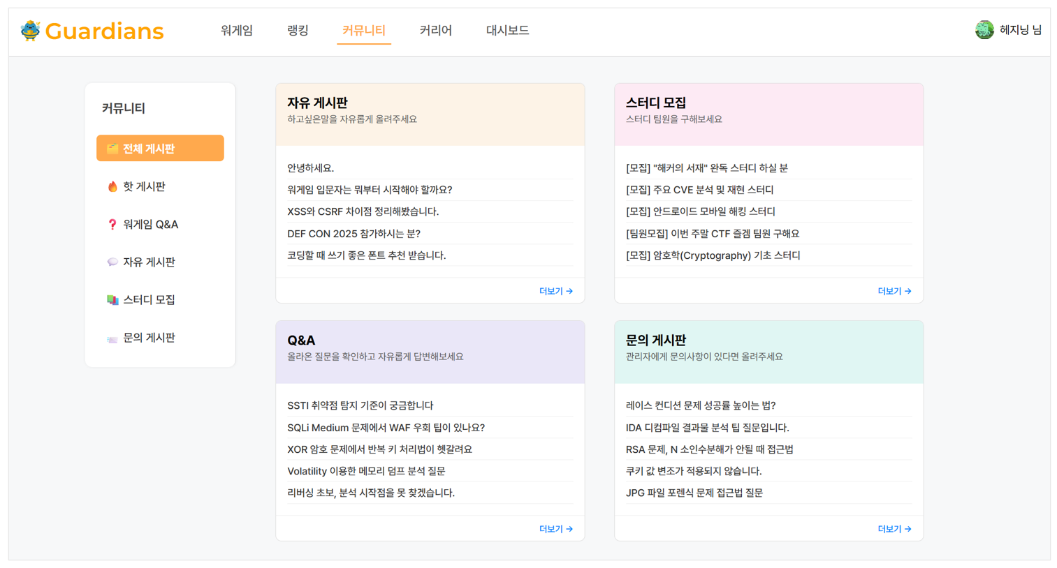 • 각 카드에는 최신 글 몇 개가 리스트로 표시되며 “더보기” 버튼으로 특정 게시판 전체 보기로 이동 가능