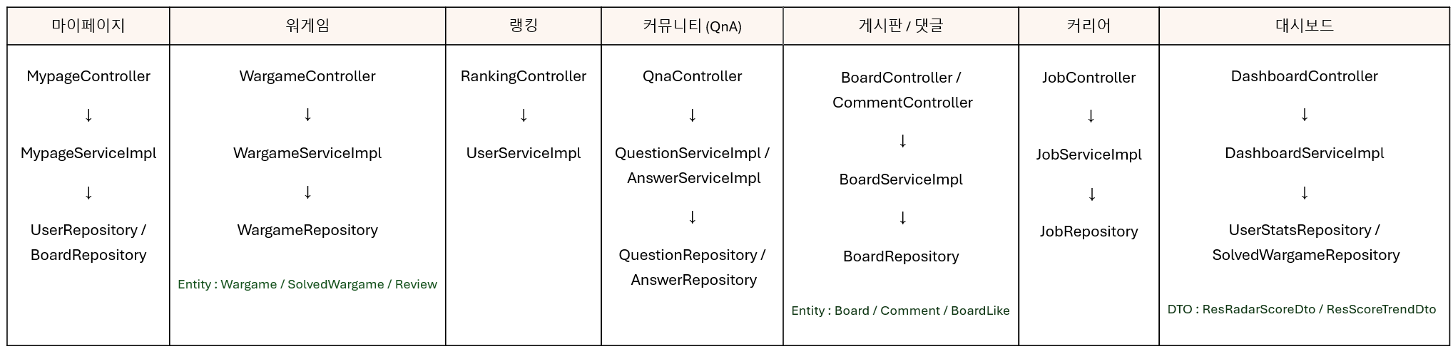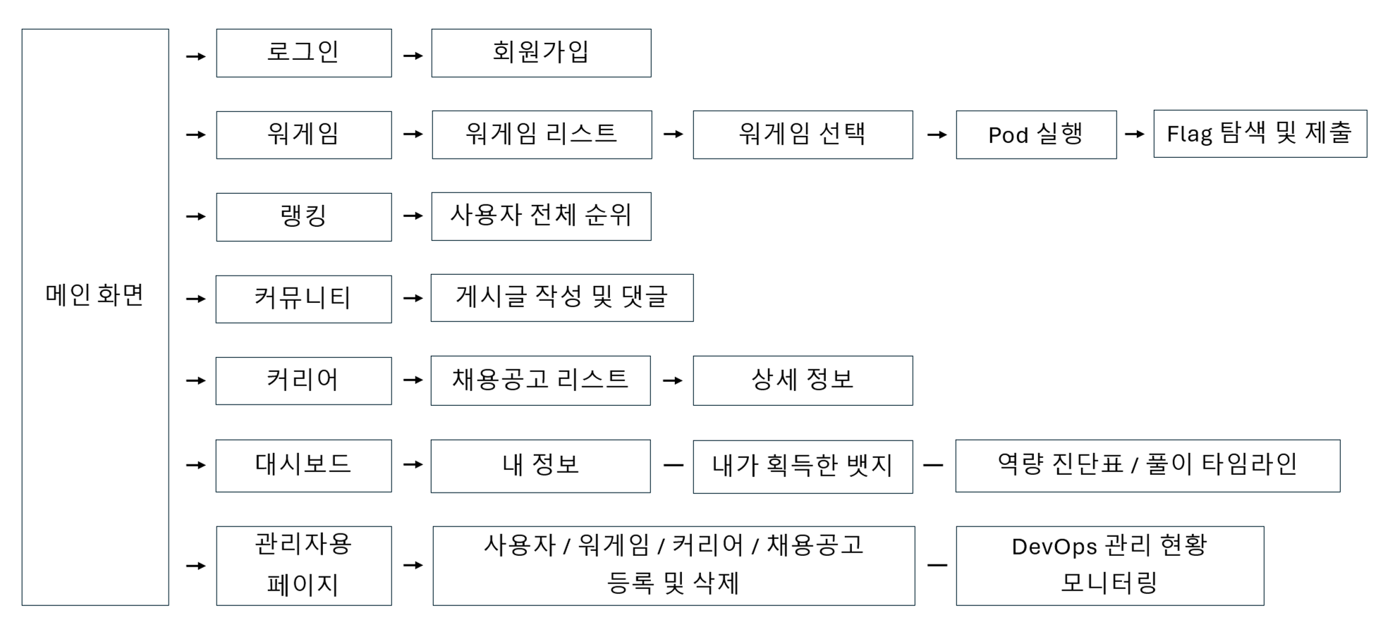 | 관리자 기능 | 워게임/채용공고 등록 및 관리, 사용자 목록 확인 및 삭제 |