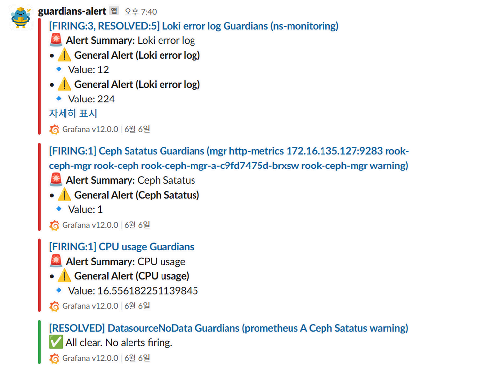 Grafana에서 설정된 경고(Alert)가 조건 충족 시, Slack 채널로 실시간 알림을 전송하여 관리자에게 전달
