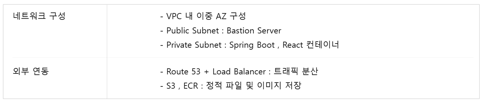 | 네트워크 보안 | Bastion 서버, Public/Private 서브넷 분리 및 접근 제어 |