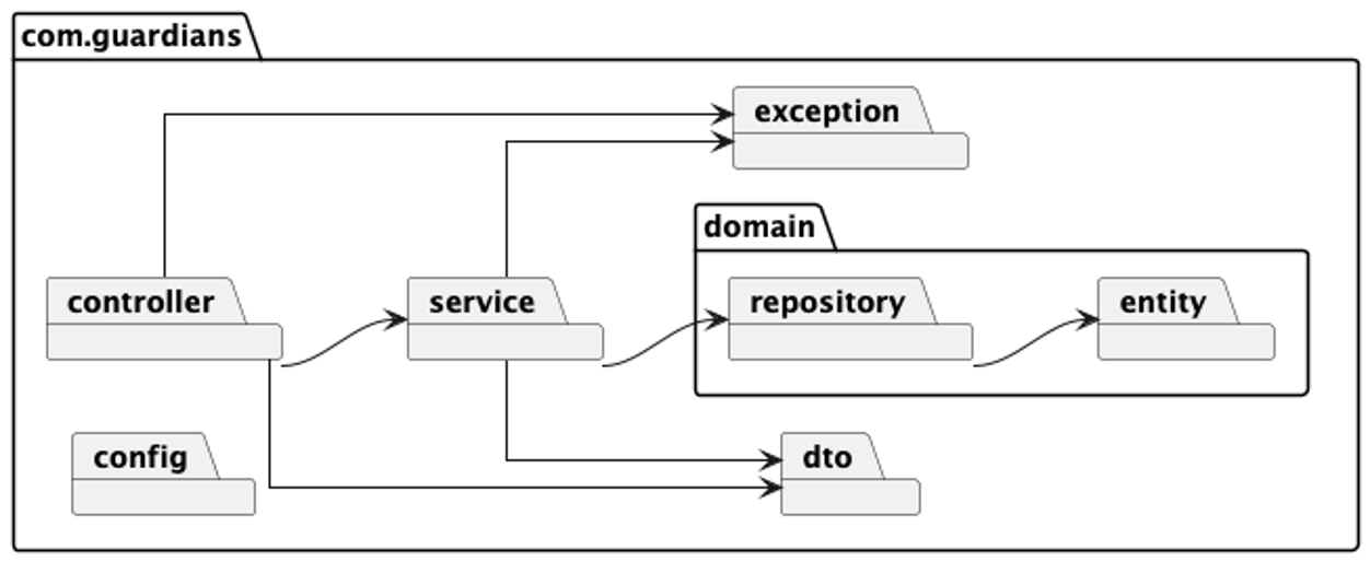 이 패키지 다이어그램은 백엔드 전체 구조의 의존 관계를 시각화한 것입니다.