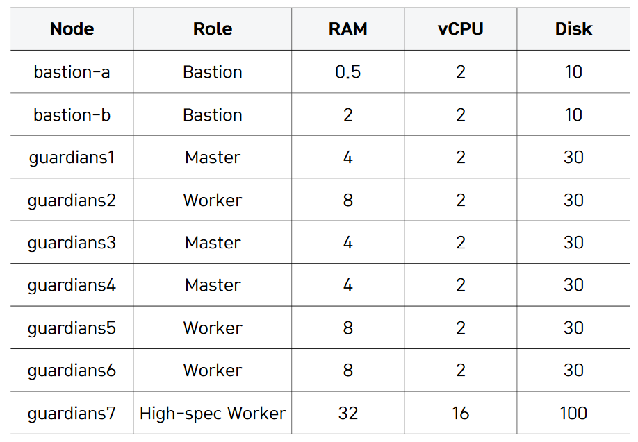 | 고가용성 구성 | 2개 AZ 기반 Master/Worker 분산 배치 |