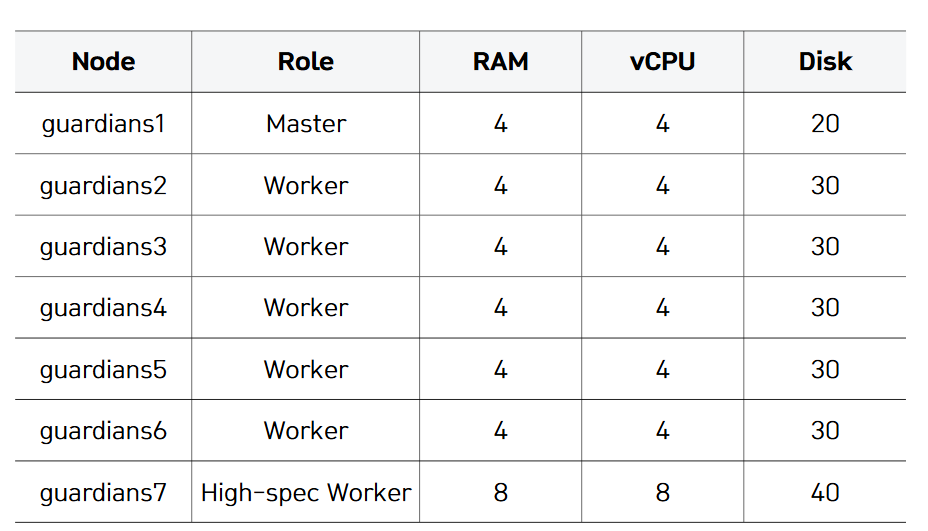 온프레미스는 1대의 Master와 5대의 일반 Worker, 1대의 고사양 Worker 노드로 구성되었으며
