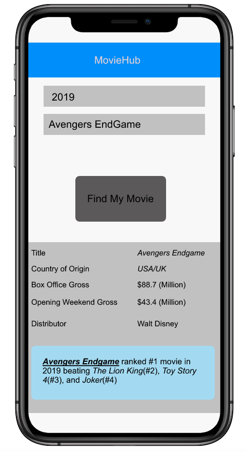 1.2 Given a feed of movie data is available When a user inputs "2019" in the year textbox and inputs "Avengers: Endgame" in the Movie Name textbox Then the results should appear at the bottom of the screen showing these attributes: Title: Avengers: Endgame Country of Origin: USA/UK Box Office Gross: $88.7 (Million) Opening Weekend Gross: $43.4 (Million) Distributor: Walt Disney
