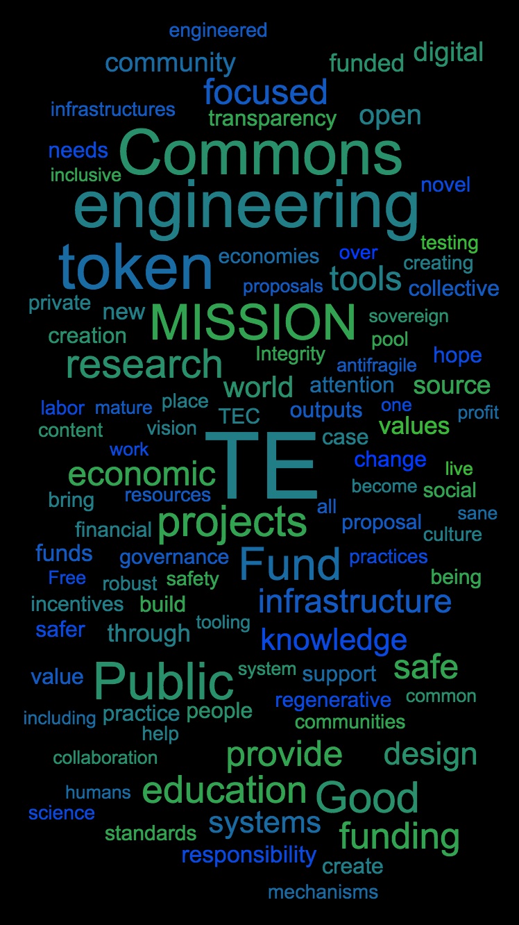 The TE Commons mission is to gather and steward the efficient distribution of funds to projects in the emerging field of token engineering to encourage the robust and ethical design of tokenized infrastructures. The TE Commons will curate and connect projects to the resources they need, while also evolving and maintaining our own healthy culture & regenerative infrastructure where capital supports contributions, contributions create value, value empowers token engineers, and people who appreciate token engineers being empowered contribute capital of all sorts.