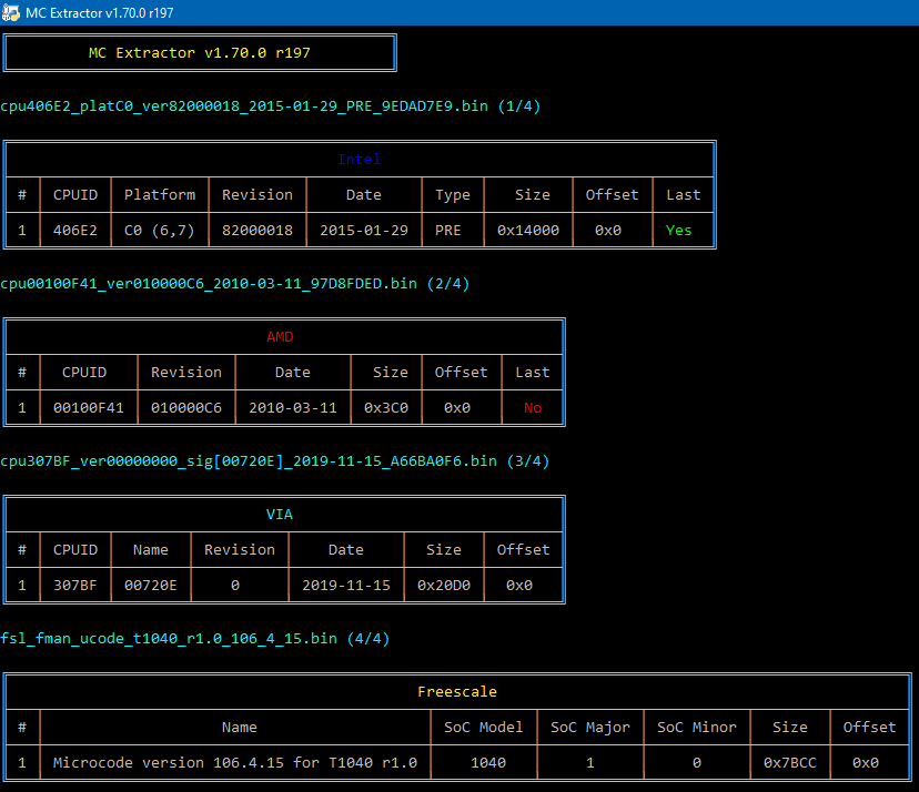 MC Extractor allows end-users and/or researchers to quickly extract, view, convert & report new microcode versions without the use of special tools or Hex Editors. To do that effectively, a database had to be built. The Intel, AMD, VIA & Freescale CPU Microcode Repositories is a collection of every Latest Production Intel, AMD & VIA CPU Microcodes we have found. Its existence is very important for MC Extractor as it allows us to continue doing research, find new types of microcode, compare releases for similarities, check for updated binaries etc. Bundled with MC Extractor is a file called MCE.db which is required for the program to run. It includes entries for all Microcode binaries that are available to us. This accommodates primarily two actions: a) Check whether the imported microcode is up to date and b) Help find new Microcode releases sooner by reporting them at the Intel, AMD, VIA & Freescale CPU Microcode Repositories Discussion thread.