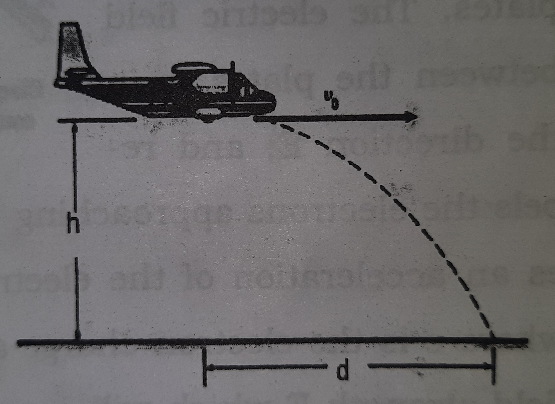 A pilot wants to drop survey markers at remote locations on the land. If he flies at a constant velocity vo = 40 m/s at altitude h = 30 m and the marker is released with zero velocity relative to the plane, at what horizontal distance d from the desired impact point should the marker be released?