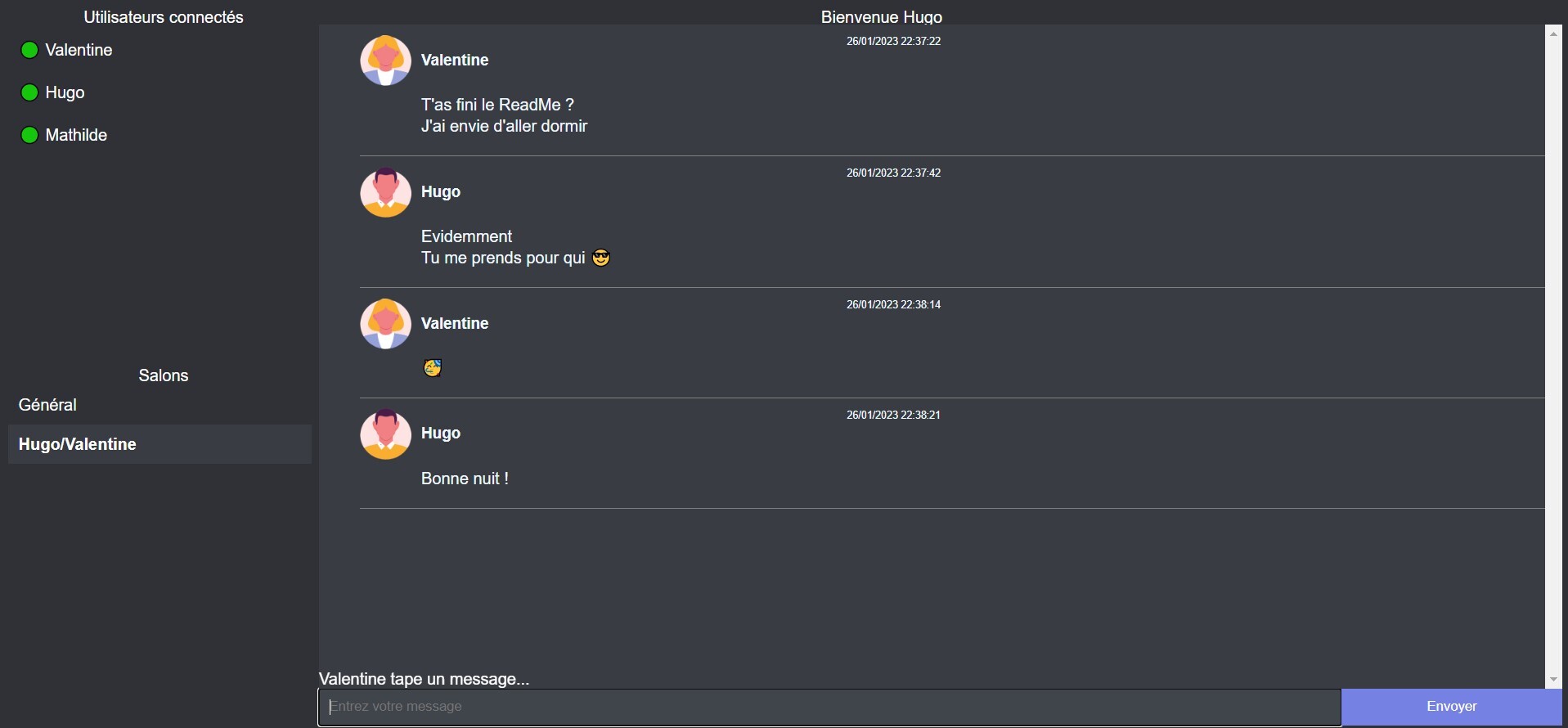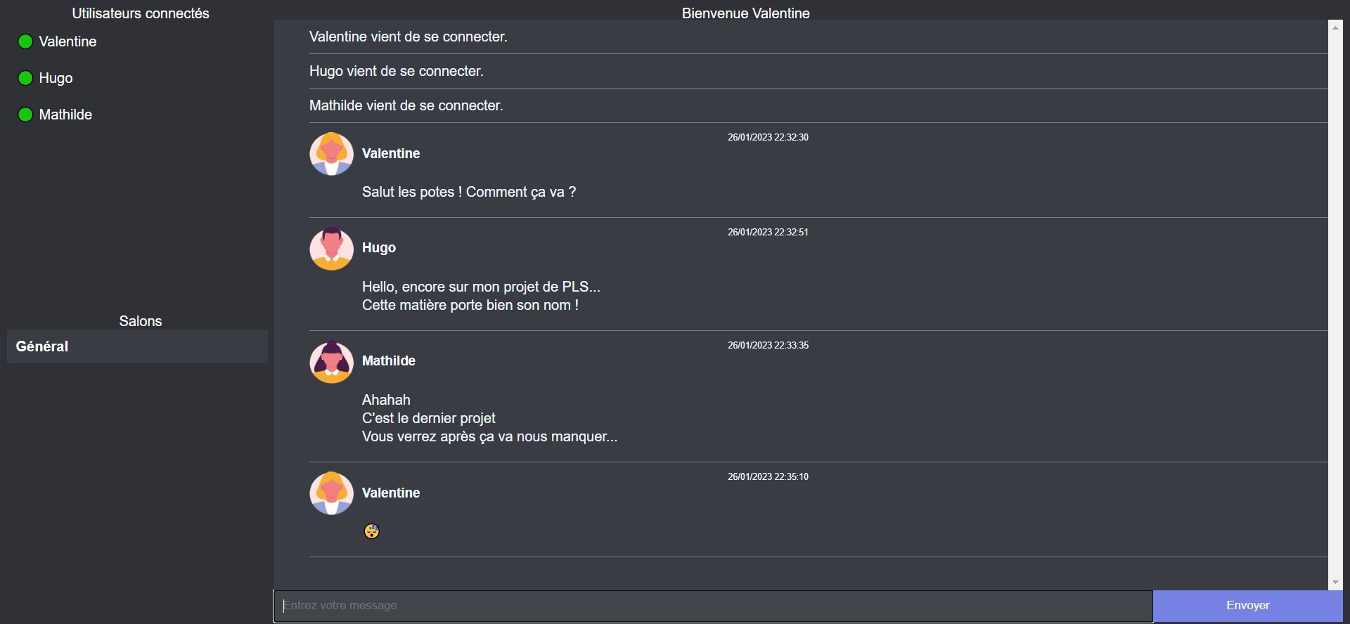 - Envoyer un message dans un salon général : tout le monde peut se connecter à ce salon. C'est le salon par défaut à la connexion.
