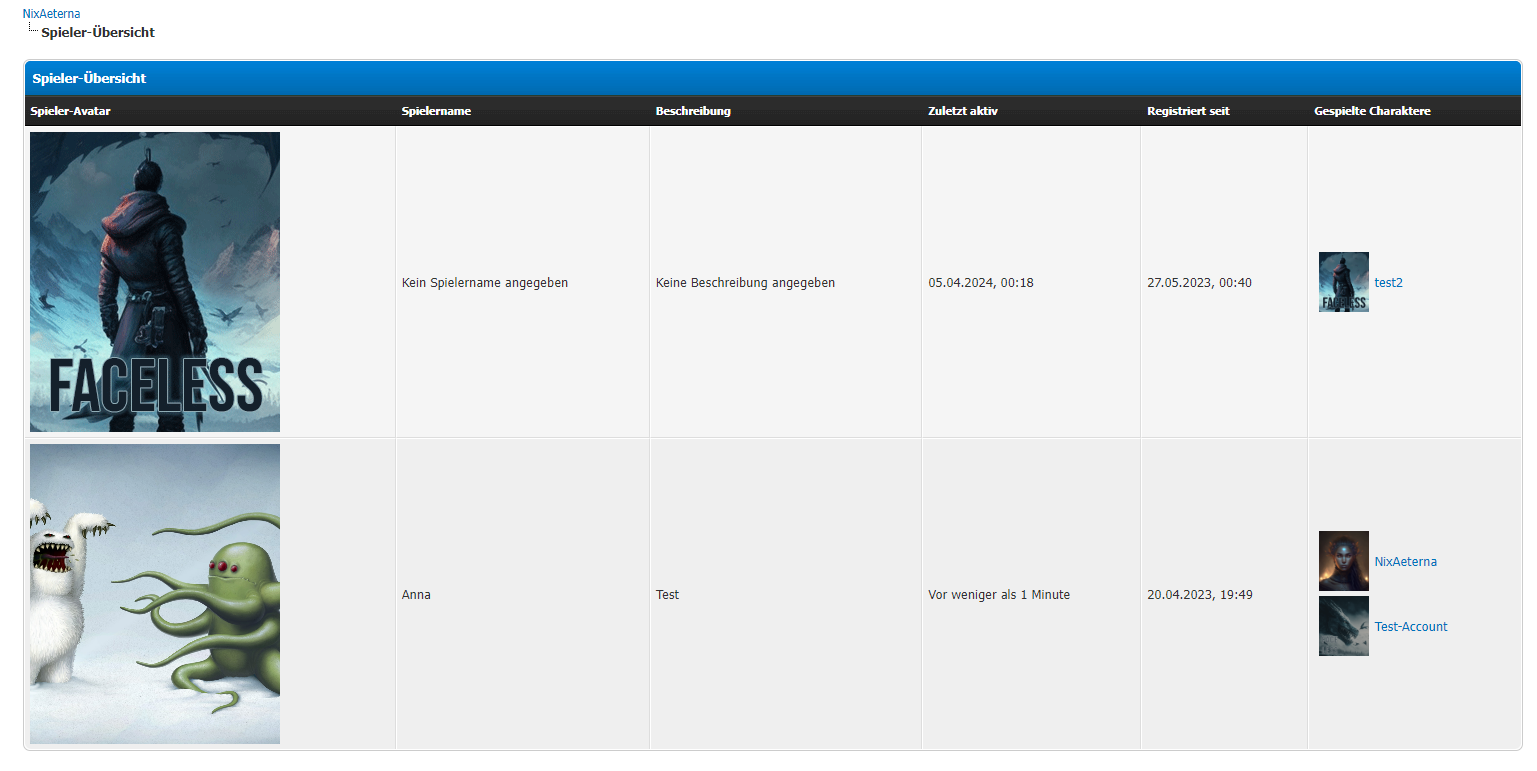 Dieses "Spieler-Übersicht" Plugin erstellt eine Wer ist Wer Liste - es ermöglicht somit Spieler/innen, eine Liste der gespielten Charakteren auf einer separaten Seite anzuzeigen. Spieler/innen können einen Spieler-Namen, eine Spieler-Beschreibung, und einen Avatar für die Spieler-Übersicht angeben. Das Plugin arbeitet nahtlos mit dem Accountswitcher Plugin von doylecc zusammen, was bedeutet, dass jede/r Spieler/in die Angaben (Name / Beschreibung / Avatar) nur einmal machen müssen, und alle angehängten Accounts erhalten automatisch dieselben Angaben.
