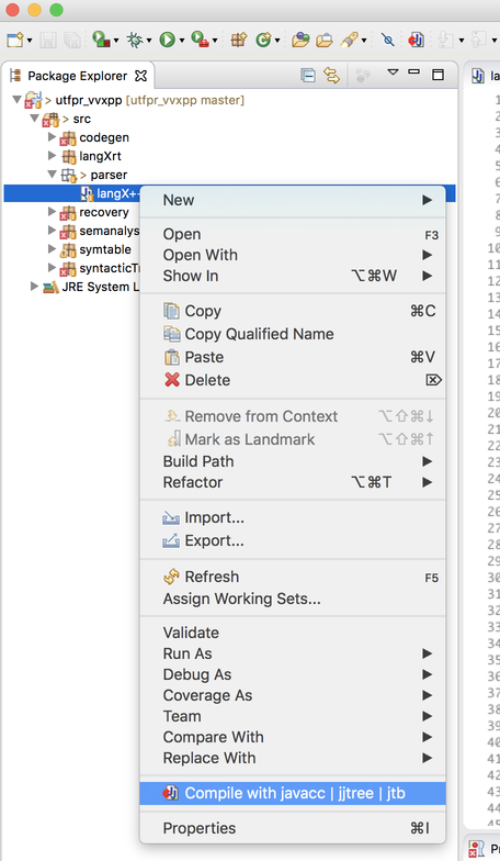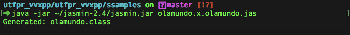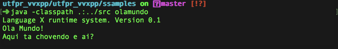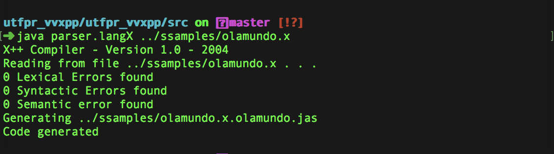 javac langXrt/Runtime.javajava parser.langX ../ssamples/olamundo.xjava -jar ~/jasmin-2.4/jasmin.jar olamundo.x.olamundo.jasjava -classpath .:../src olamundo