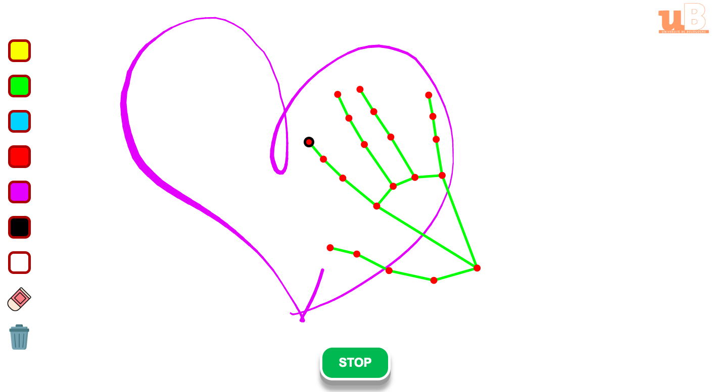 Dessinez dans votre navigateur web en utilisant l'index de la main à l'aide de votre caméra. La détection se fait grâce à l'API Javascript de Mediapipe pour la détection de mains, qui utilise des algorithmes d'apprentissage automatique. Le modèle utilisé est celui fourni par Mediapipe, qui a été entrainé sur plus de 30k images.