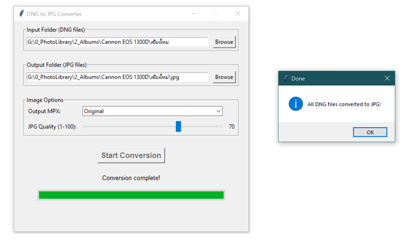 - EXIF Metadata Preservation: All EXIF data from the original DNG file is copied to the converted JPG, maintaining important image information.