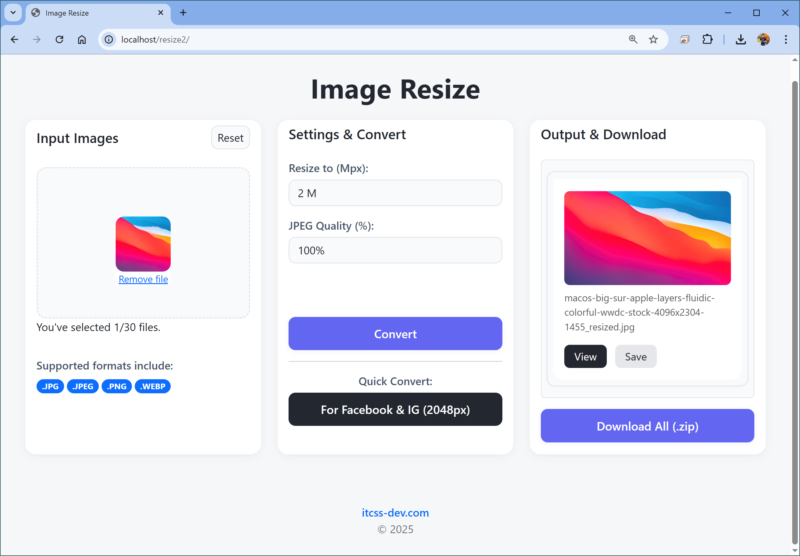 - Quick Convert Presets: Includes dedicated buttons for common use cases, such as optimizing images for Facebook & Instagram (2048px).