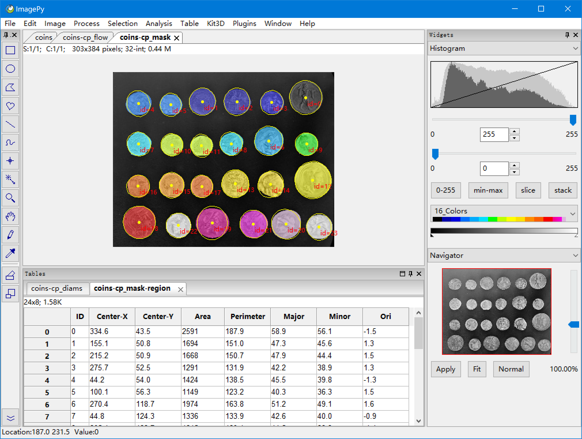 Menus: Analysis > Region Analysis > Geometry Analysis do a region analysis. And we can do many other things in ImagePy, such as set a colormap, or overlay the mask on the original image.