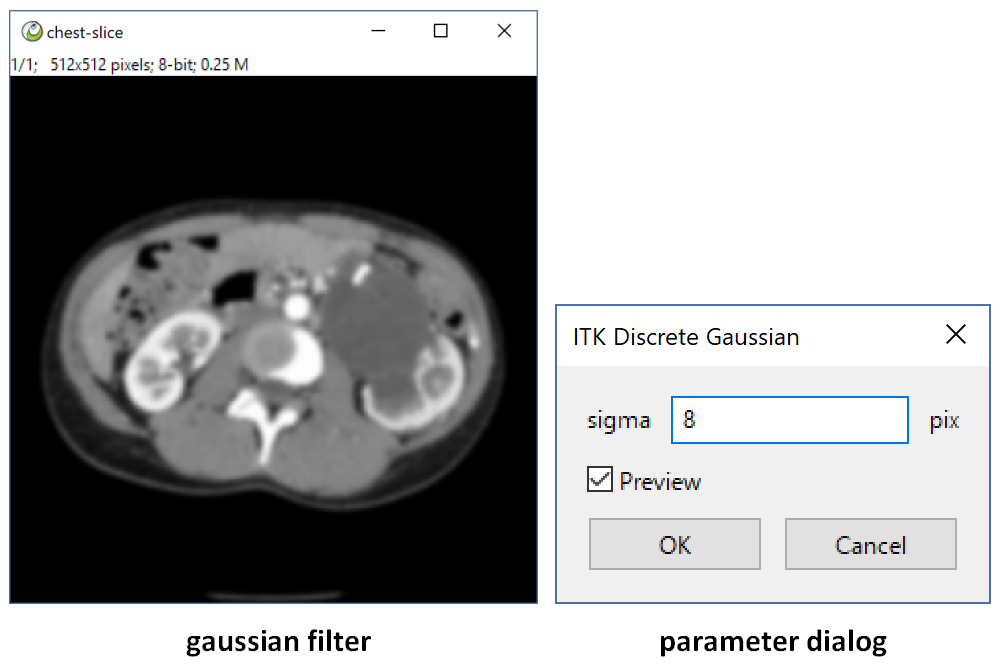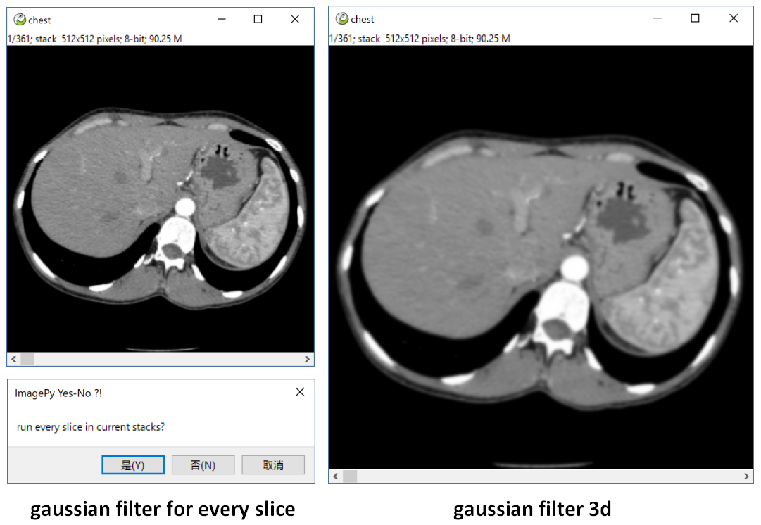 imgs[:] = sitk.GetArrayFromImage(itkimgs)when there is a image sequence, If you run a gaussian filter, it will ask if you want to process every slice. If ok, it will process slice by slice. But a 3d gaussian filter will blur the image sequence by X, Y and Z axis.