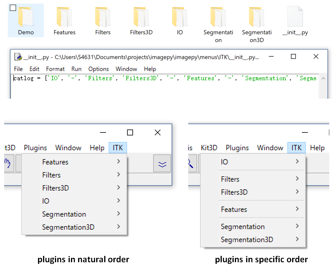 ImagePy is a plugin framework. The Catlog will be parsed as the corresponding menus. You just copy package under the menus folder or it's sub folder. But the question is, Our function will be in a disordered order. So we can add a list called catlog under every init file.