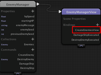 We then later represent that change in our game by instantiating a game object with a View that points to the correct ViewModel. In your EnemyManagerView you can add a special binding called CreateEnemyView where you'll instantiate your EnemyView.