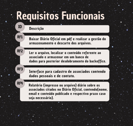 A partir da apresentação do desafio enfrentado pela empresa parceira, MidAll[B], a solução desenvolvida se configura em um Crawler com sistema de gerenciamento de associados, que compreende em um sistema que consiga buscar, ler o arquivo e distinguir o conteúdo referente aos Professores Associados, realizar os cruzamentos essenciais de acordo com as bases de dados de colaboradores que carregam está explicação, registrar todos os processos publicados relacionados aos associados, e emitir relatório diário para que a equipe do Backoffice consiga disparar os e-mails para os docentes citados no Diário Oficial.