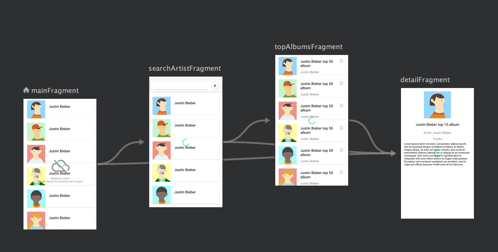 Fragmentwhich acceptsid,albumNameandartistNameas arguments and then makes the call to the server to get the specific album detail. - Search Artist - where it searches for artists based on a name.