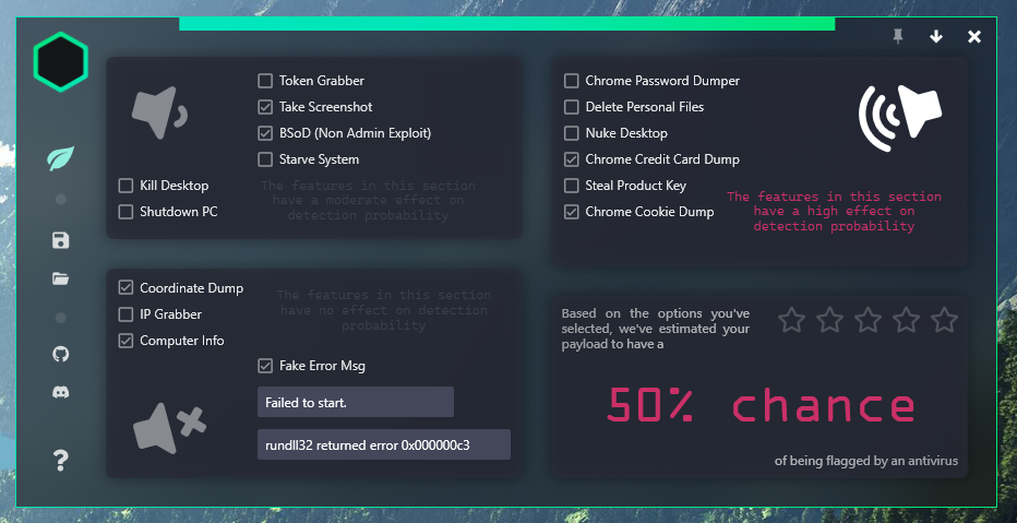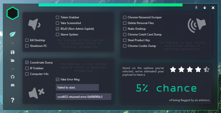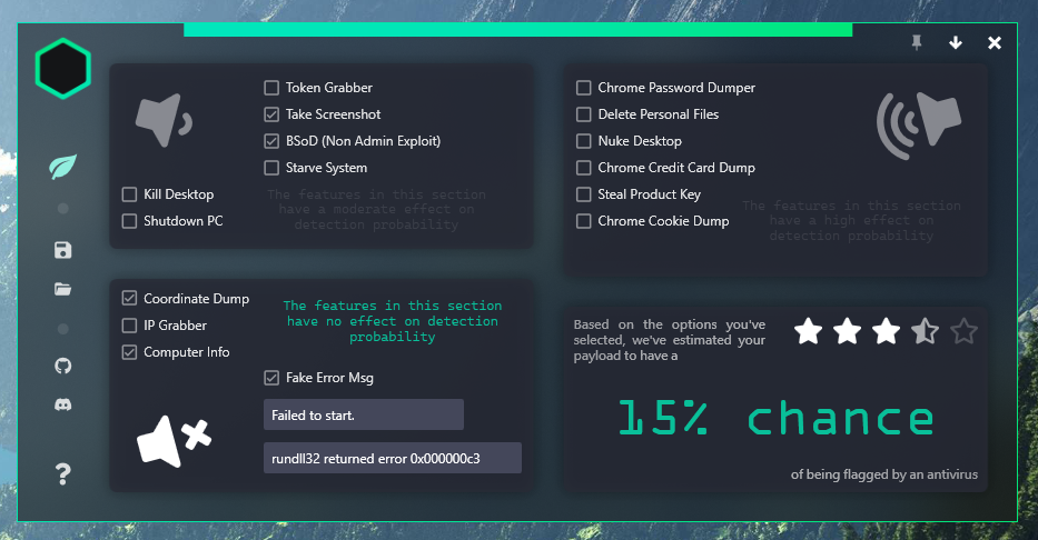 In full, Liveton is a custom payload creation tool designed for use in a penetration testing environment to obtain potentially useful information about a target, such as advanced location data, saved chromium data (passwords & cookies), Windows activation information, and a couple other useful bits of general system info. There are also a few extra bells and whistles that were meant to help potentially lower suspicion / make the payload more difficult to analyze like killing the explorer (desktop) process, displaying fake error pop-ups, triggering a Hardstop [BSoD] via NTAPI, and wiping personal file directories. This is the 3rd major evolution of this software, hence Mk3