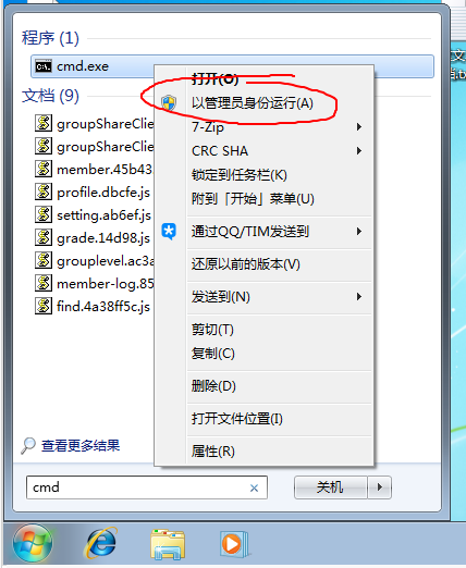 如果是 Win7 的话, 如图搜索 cmd 右键以 管理员 权限打开
