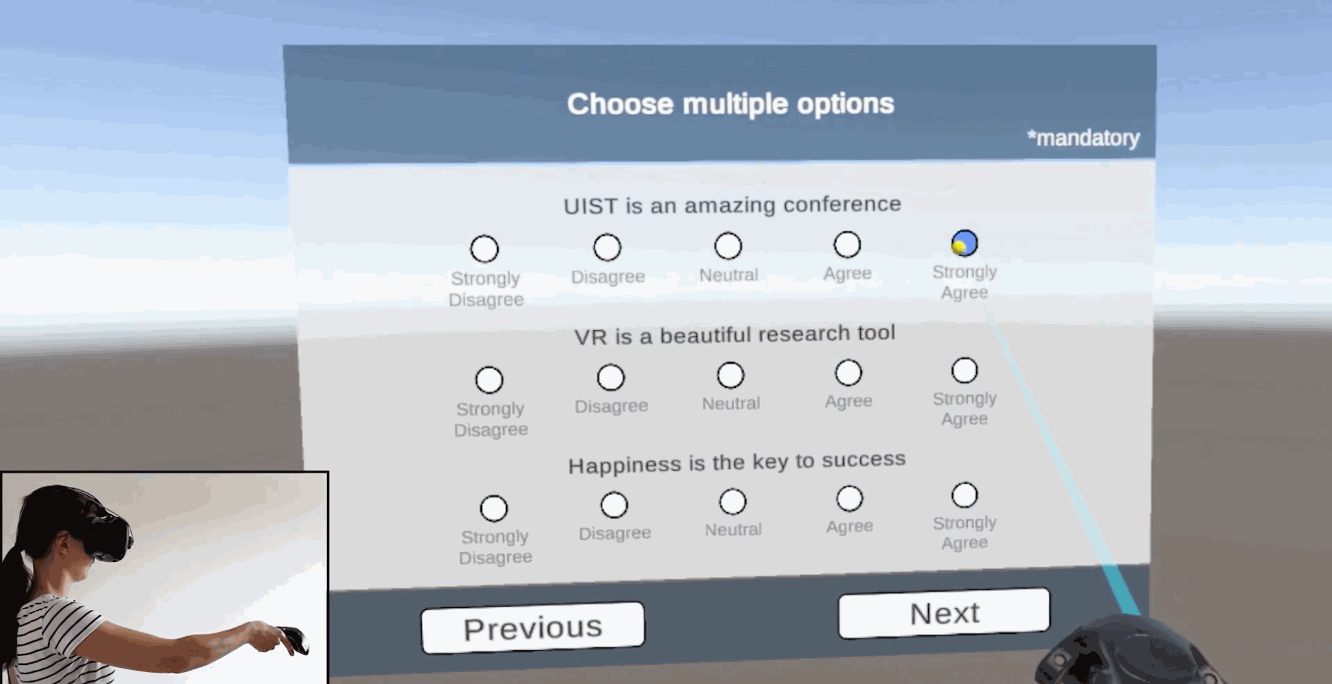 - 📙NASA TLX, Simulation Sickness Questionnaire, IPQ and SUS Presence Questionnaire, System Usability Scale and more already included.