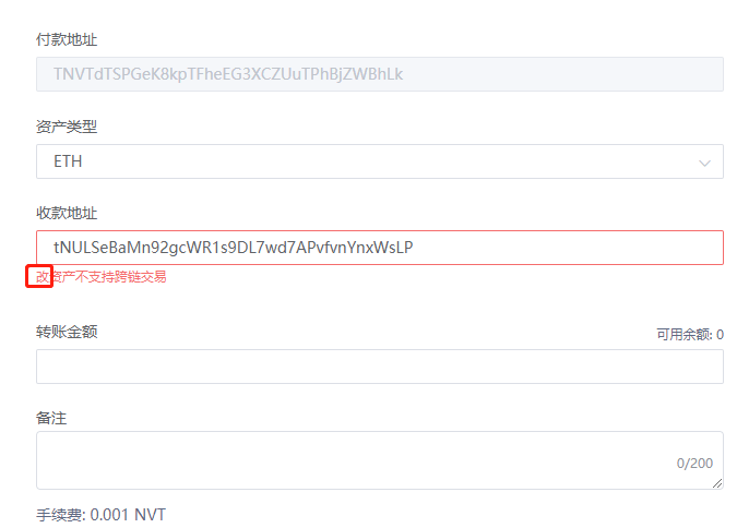 http://beta.wallet.nerve.network/transfer NERVE网页钱包转账的时候提示错误 网页提示“改资产不支持跨链交易” 应该提示"该资产不支持跨链交易"  钱包地址:NULSd6Hgiz6DdeYZTW6wHAm2yGBQiZAvkQV8X
