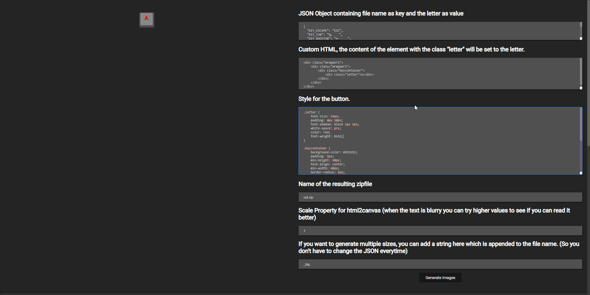 You have a web form, where you can fill in a base HTML structure and your own CSS (of course examples are also already given), and the script then iterates through a list of characters and generates an image for every possible character by putting it into your base structure and then taking a "screenshot" using html2canvas and so you have less work, JSZip is used to put it into a neat zip file, which you just have to downoad.