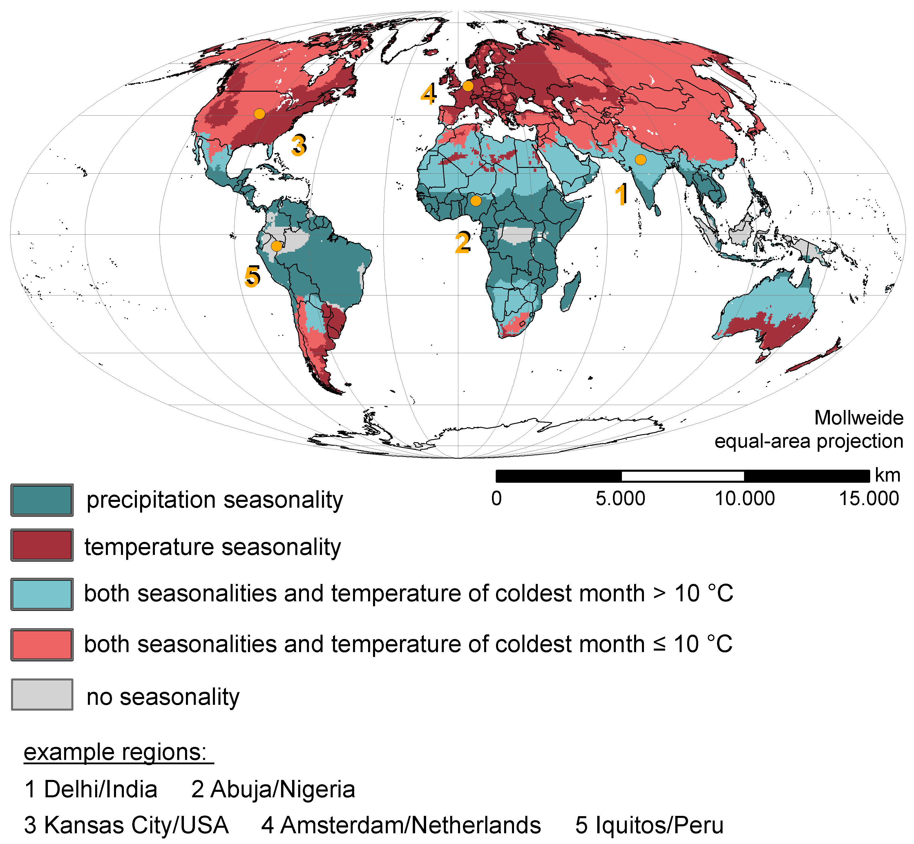 Figure 2: Global distribution of seasonality types. For each seasonality type one example region is marked.