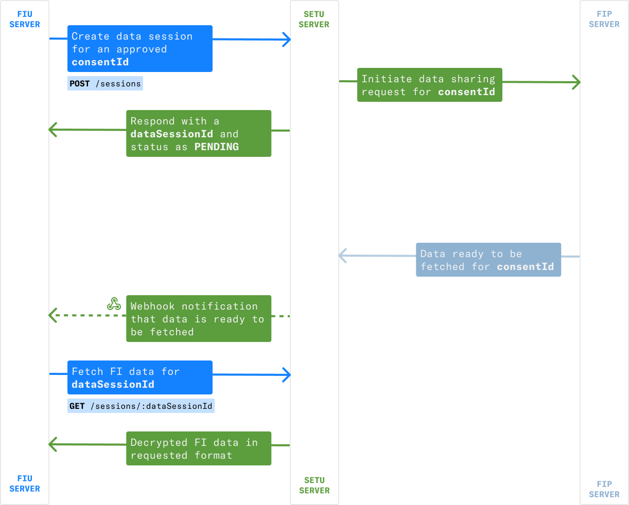 - **Create Data Session**—Call this API against an `APPROVED` consent. This initiates data preparation at user's linked FIP accounts. You will be notified by Setu once the data is ready to be fetched.