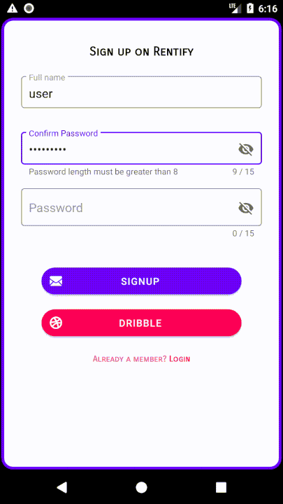 SignUp screen with TextInputLayouts using updated material theme "style="@style/Widget.MaterialComponents.TextInputLayout.OutlineBox.Dense" Demonstrating newly added properties